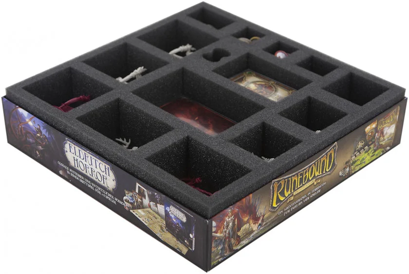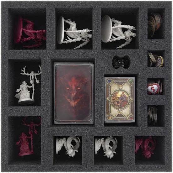 A further seven compartments provide a quick overview and prevent a time-consuming mix up of the other components. There are two compartments of different measurements for both card sizes. Tokens can be clearly sorted into the other compartments. Map tiles can be put beneath the foam tray. This will cause the box cover to protrude slightly.