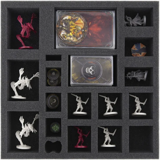 All of the ten plastic figures are given their own, precisely tailored compartment. Thereby the Bandits' swords are spared from buckling as well as the claws of the spirits. Moreover, painted figures are protected against abrasion. The foam tray (dimensions: 247 mm x 247 mm x 40 mm height) and the topper contained in the set are made of high-quality, chlorine- and acid-free foam.