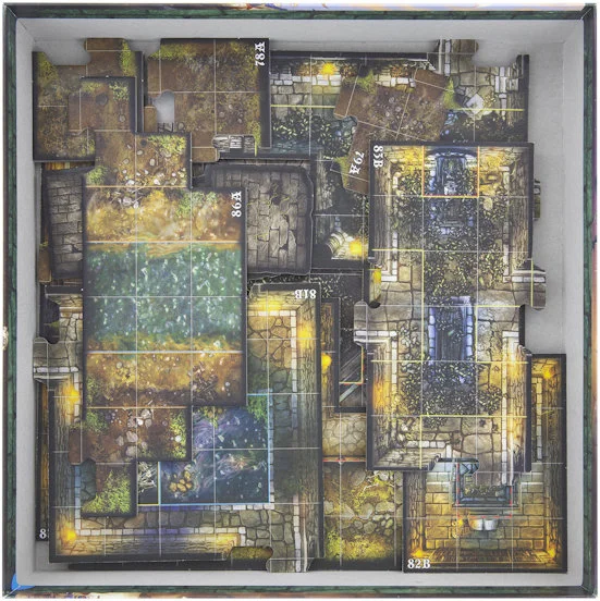 A further nine compartments ensure the organization of the other game components, such as tokens and game cards. The cards can be divided into two compartments of different sizes. This way you can always keep a good overview. Annoying mix up of the game material is avoided. The 16 map tiles find their place under the foam tray. The two Hero Sheets, as well as the Rulebook/ Quest Guide lie on the foam topper.
