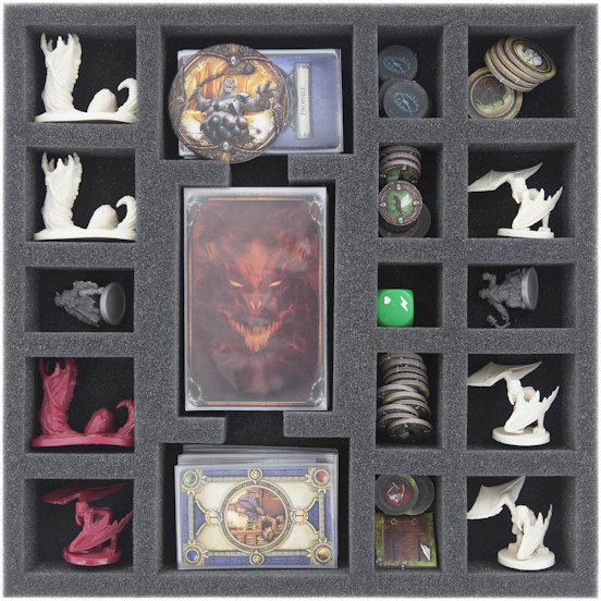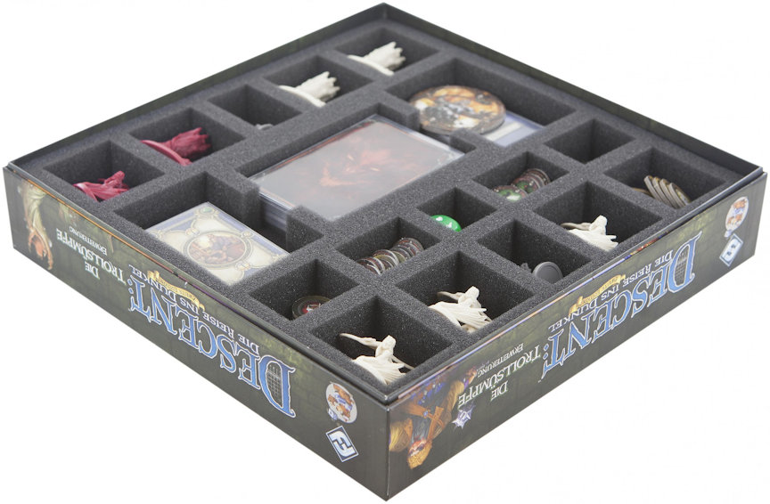 To make sure your box doesn't look like Bol'Gorteth has payed you a visit, we present the foam tray set for the original Descent: Journeys in the Dark 2nd Edition The Trollfens board game box. The set consists of one foam tray with the dimensions 247 mm x 247 mm x 35 mm height, which fits exactly into the box. In addition, there's a matching topper. Both are made of chlorine- and acid-free foam.