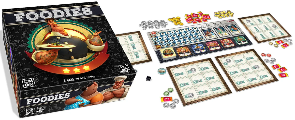 In Foodies, players take on the role of managers in a Food Court. During the game, they will add new dishes to their menu, connecting the stars between different dishes. These recipes come from all over the world, granting different bonuses when added. What’s more, players can hire Chefs to work in their kitchens, including special, prestigious Chefs who are the best in the business. In the end, the player who gains the most Popularity will be declared the food master and win the game.
