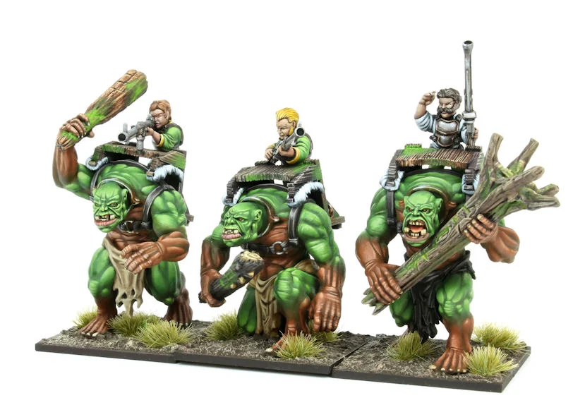 Contents: 3 x Resin Halfling Forest Trolls Gunners, 3x MDF 40mm Square Bases