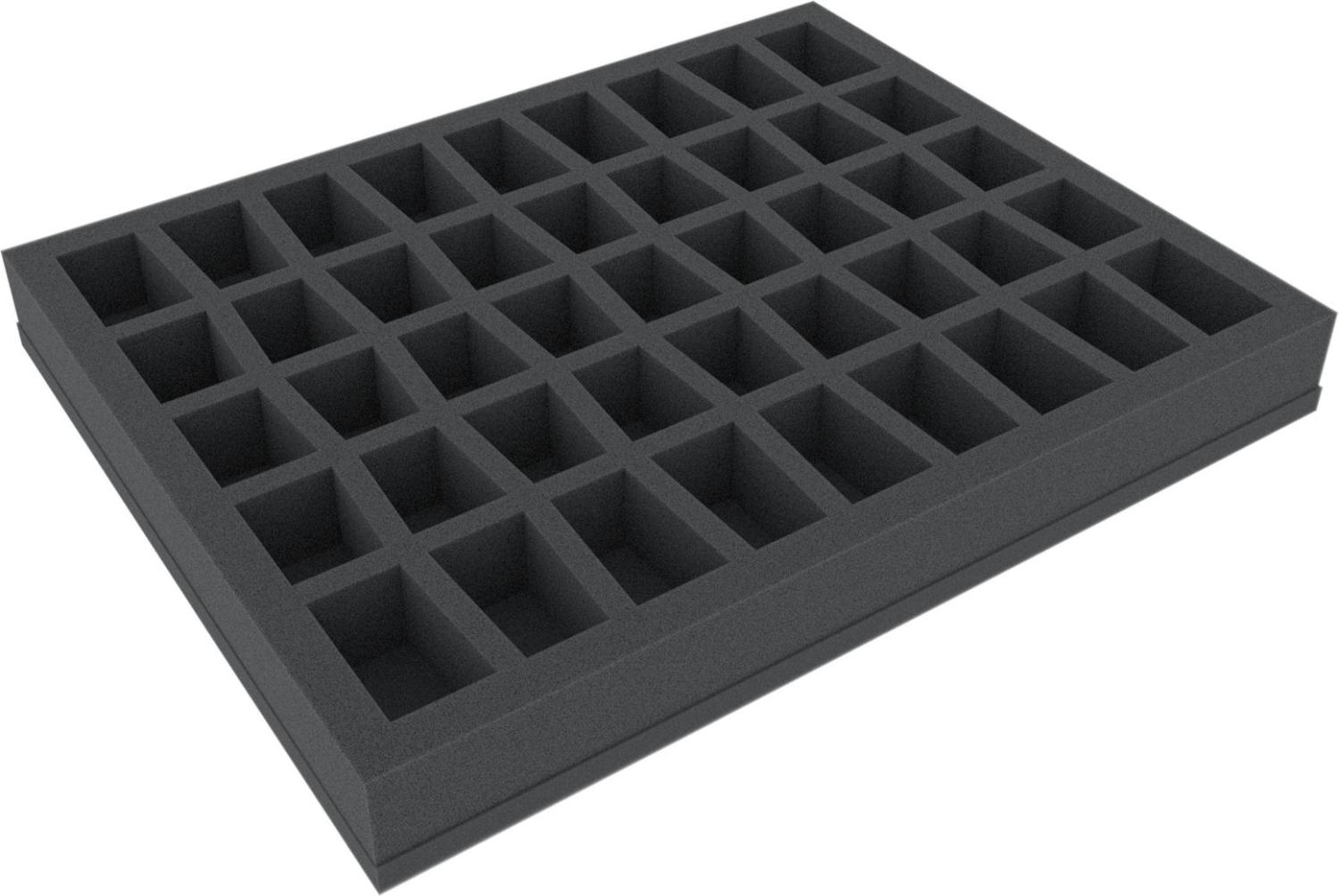 Foam tray with c-slot design. The slots have a conical footprint. The dimensions of the foam mat with 45 slots is the same as that of the foam mat with 36 slots (345 mm x 275 mm). We have the slots arranged in a space-saving and optimizing the distances between the slots. On the mat five rows are pre-punched with a nine slots. The length of the longest side of the slot varies in three stages: 37, 39 and 49 mm. So you have the following slots 18x slots 49 mm x 25/30 x 30 mm (L x B x D) 18x slots 39 mm x 25/30 x 30 mm (L x B x D) 9x slots 37 mm x 25/30 x 30 mm (L x B x D) The conical cut-out shape provides extra space for your miniatures. In contrast to the standard insert (FS035C5B) with 25 mm nominal height you have here another 5 mm more height available.