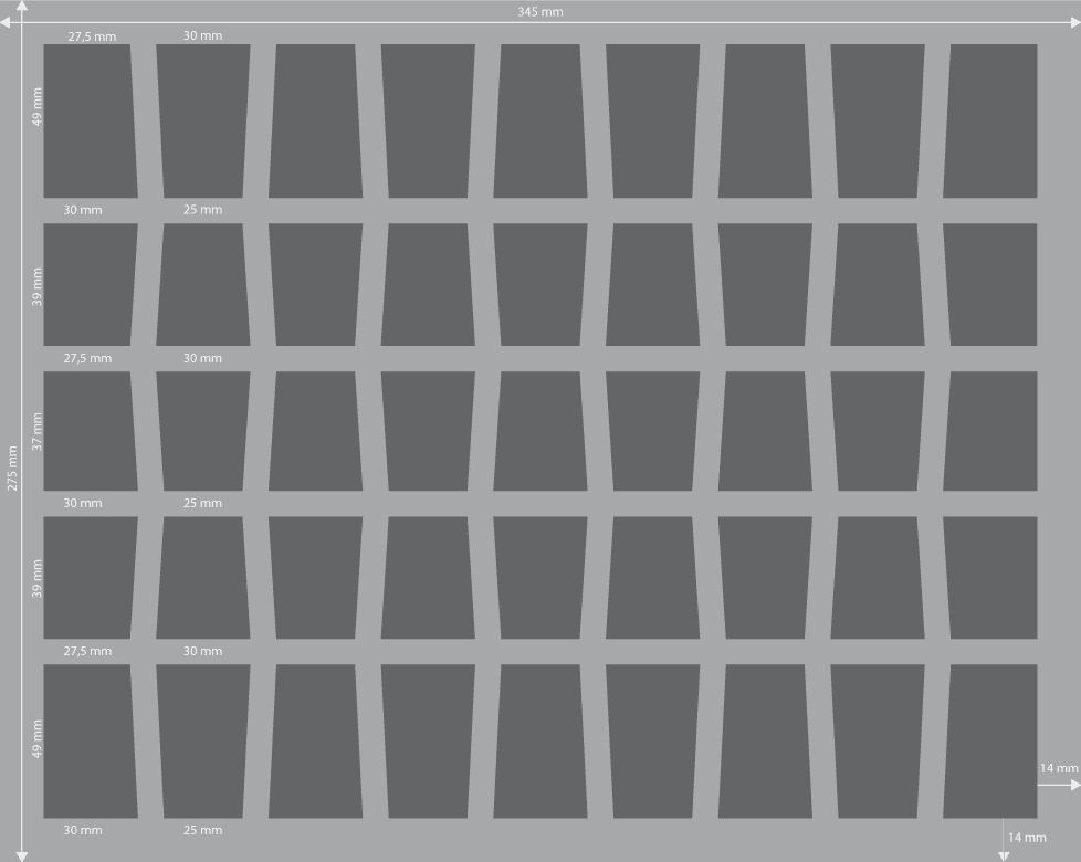 Foam tray with c-slot design. The slots have a conical footprint. The dimensions of the foam mat with 45 slots is the same as that of the foam mat with 36 slots (345 mm x 275 mm). We have the slots arranged in a space-saving and optimizing the distances between the slots. On the mat five rows are pre-punched with a nine slots. The length of the longest side of the slot varies in three stages: 37, 39 and 49 mm. So you have the following slots 18x slots 49 mm x 25/30 x 40 mm (L x B x D) 18x slots 39 mm x 25/30 x 40 mm (L x B x D) 9x slots 37 mm x 25/30 x 40 mm (L x B x D) The conical cut-out shape provides extra space for your miniatures. In contrast to the standard insert (FS035C5B) with 25 mm nominal height you have here another 15 mm more height available.