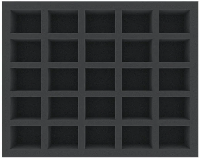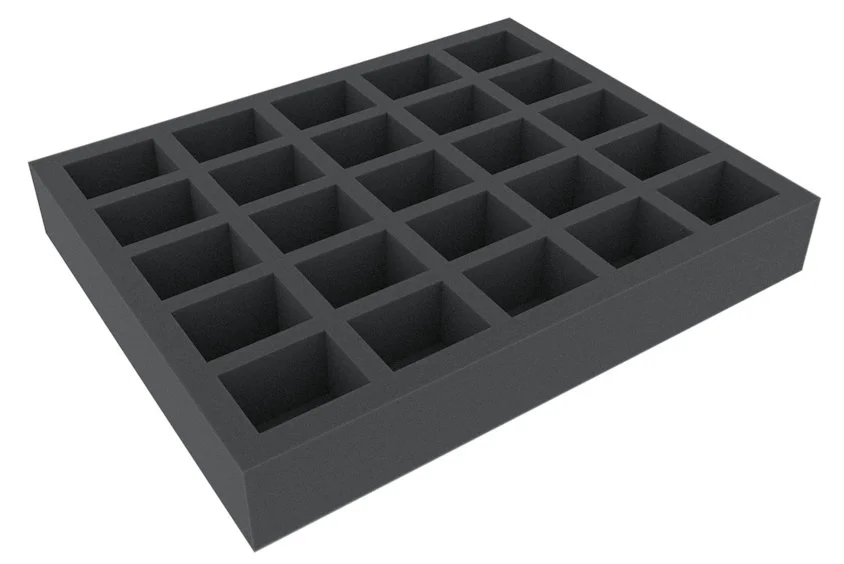 Foam tray with 25 large cut-outs for Warhammer. Cut out dimension: 54mm x 41 mm - fits nearly all large miniatures on 40 mm base. Ready to use - glued 10 mm foam base. The 50 mm depth of the foam is result from 10 mm foam base and slot foam tray with 40 mm effective depth. Dimension: 345 mm x 275 mm x 50 mm 25x slot size 54 x 41 x 40 mm height Made in Germany The offered full-size foam tray fits into our Feldherr bags, hard cases and storage boxes. Models pictured are for size comparison only. They are the personal property of Feldherr company or employees.