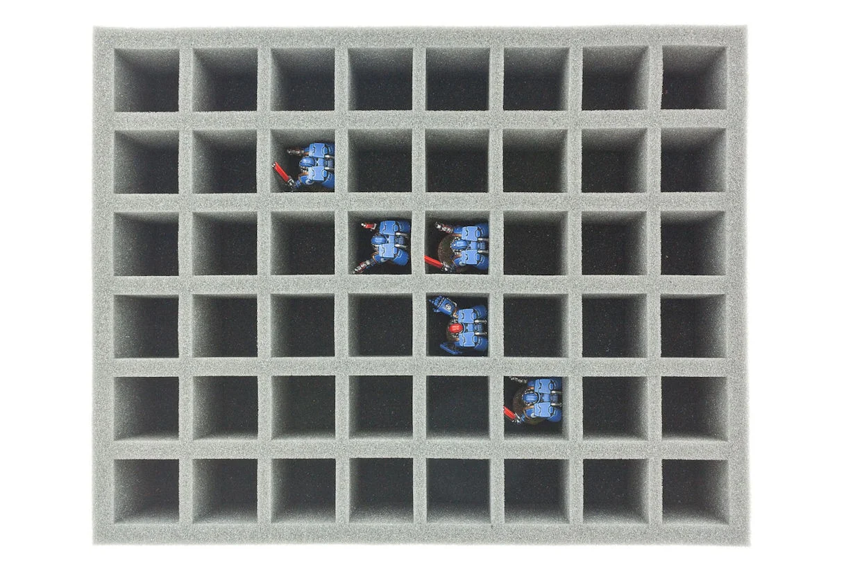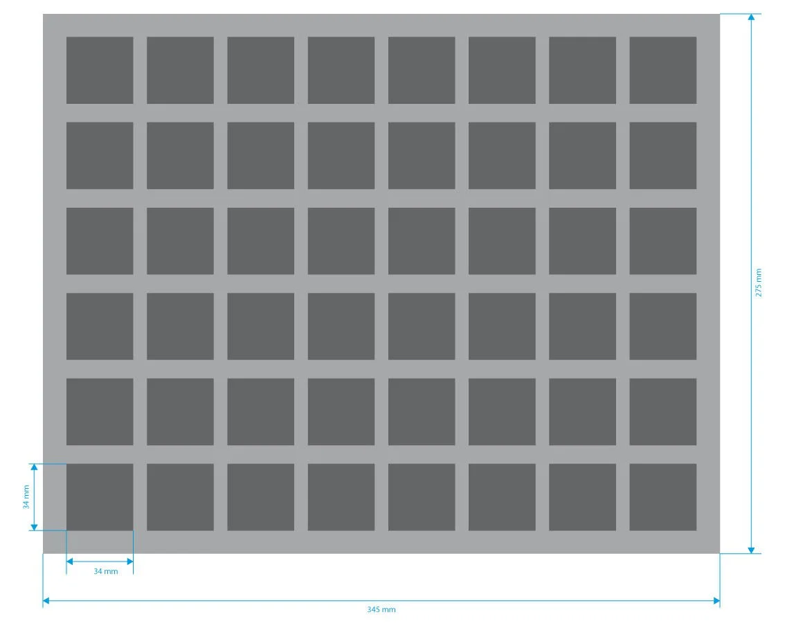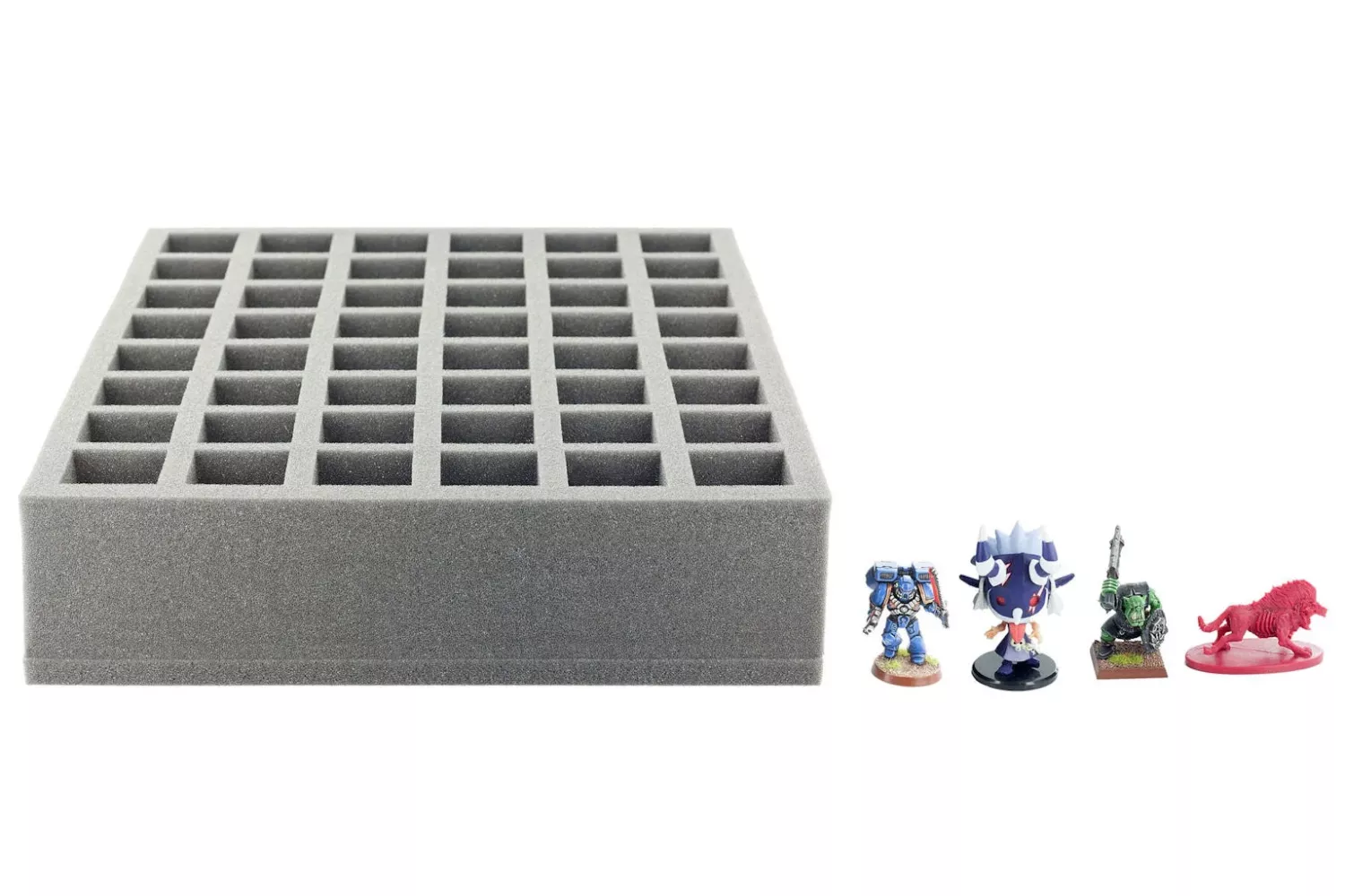 Ready to use foam tray with 48 quadratic slots (34 mm x 34 mm x 60 mm height) for all minis with a base up to 30 mm diameter / side length. This foam tray fits also Games Workshop Citadel Colors Paint Pots, Vallejo Model Paints or Army Painter Warpaints.