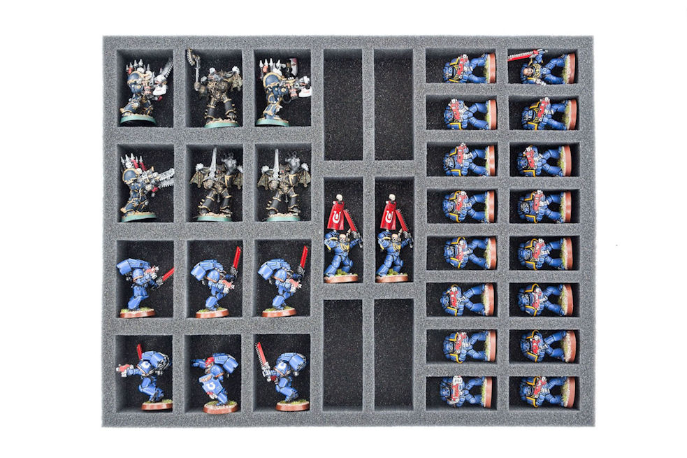 Dimension Feldherr Full-Size (FS) Foam Trays: 34,5 cm x 27,5 cm x 50 mm. The 50 mm depth of the foam is result from 10 mm foam base and foam tray with 40 mm effective thickness
