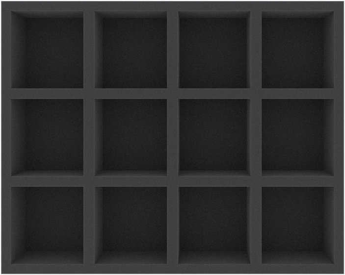 This Full-Size foam tray is divided into 12 compartments. The mat is optimally suited for the safe and clear storage of larger miniatures and for game material. Each of the 12 compartments is 78 mm long x 73 mm wide x 50 mm deep The foam tray has the dimensions: 345 mm x 275 mm x 60 mm total height (50 mm usable height + 10 mm foam base). high-quality, fine pored foam CFC-free chlorine and acid-free Made in Germany