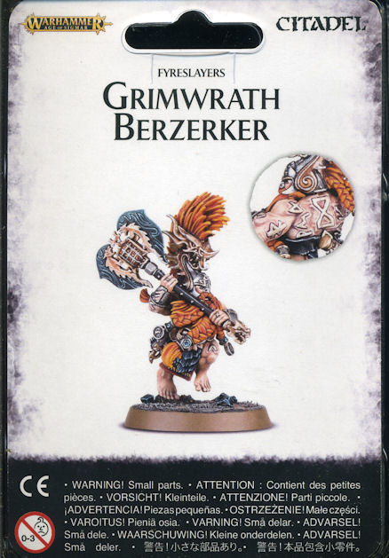 This multi-part plastic kit contains all the components necessary to build one single-pose Grimwrath Berzerker, unstoppable warrior of the Fyreslayer lodges. Armed with a fyrestorm greataxe and fyresteel throwing axes, he cuts an imposing figure with his huge mohawk and skin adorned with numerous ur-gold runes - he also features the biggest beard of any Fyreslayer! Twelve components in total, includes a Citadel 32mm Round base.