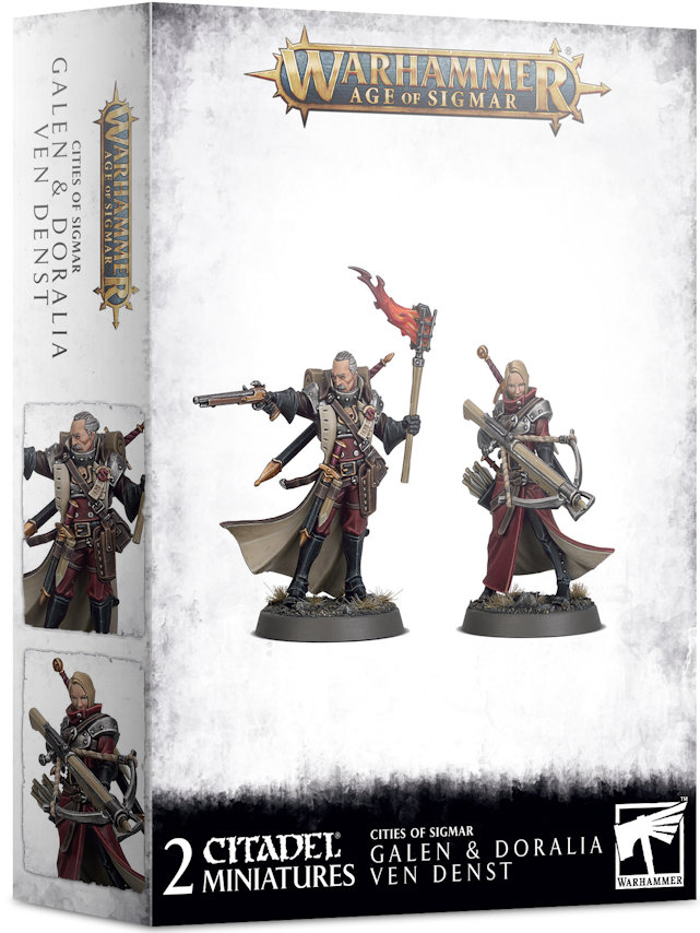 The kit is comprised of 18 plastic components, with which you can assemble one Galen ven Denst and one Doralia ven Denst. Galen can be assembled with a choice of weapon arms holding a pistol and torch, or a sword and pistol. Doralia can be assembled either with or without her tall, wide-brimmed witch hunter's hat. These models are supplied with 2x Citadel 28mm Round Base.