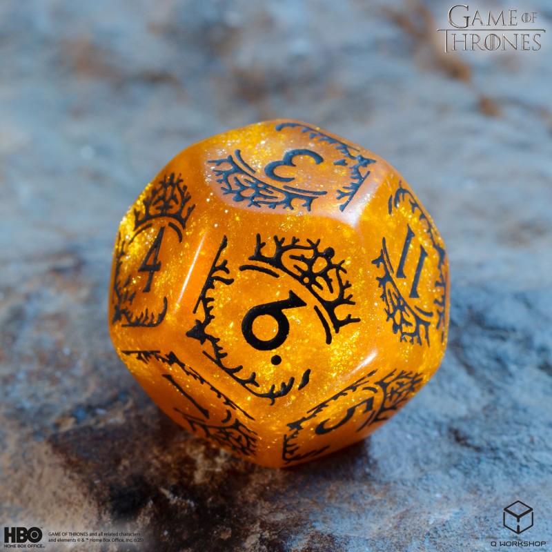 The Colors of Westeros The shimmering yellow material of the dice (infused with glitter dust) is adorned with black paintings, ensuring high readability and immersion.