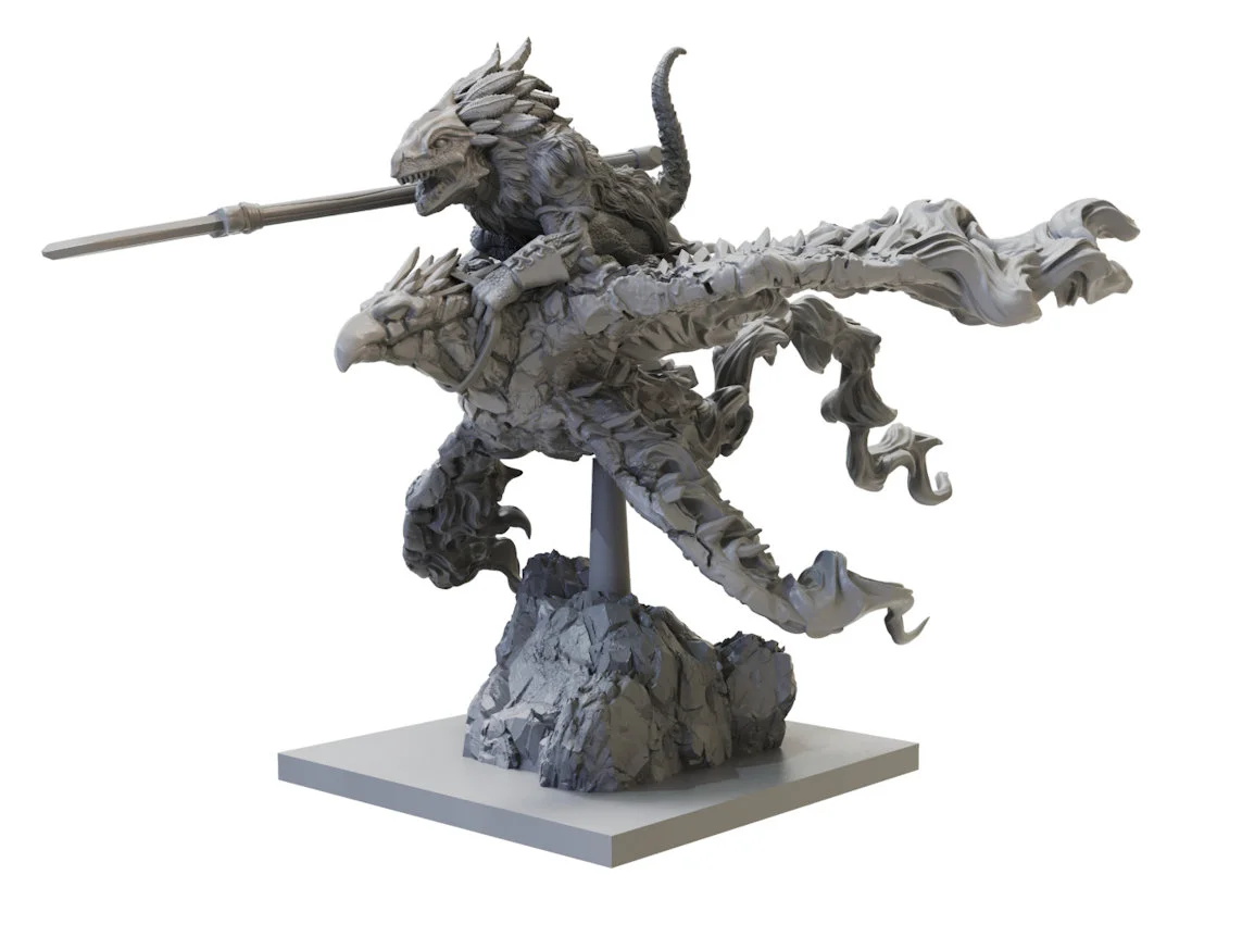 A Scorchwing is considered the ultimate prize - if you can manage to keep all your fingers and toes. The rare few that have claimed one as a mount, using protective saddles enchanted by the Mage - Priests, are the true lords of the sky and masters of the hunt. After years of training and dedication, these deeply respected elite hunters have formed an incredible bond with their sleek, fiery Scorchwing mounts. Contents: 1x Resin Salamander Ghekkotah Skylord 1x Small Plastic Flying Base 1x 50mm Square Base