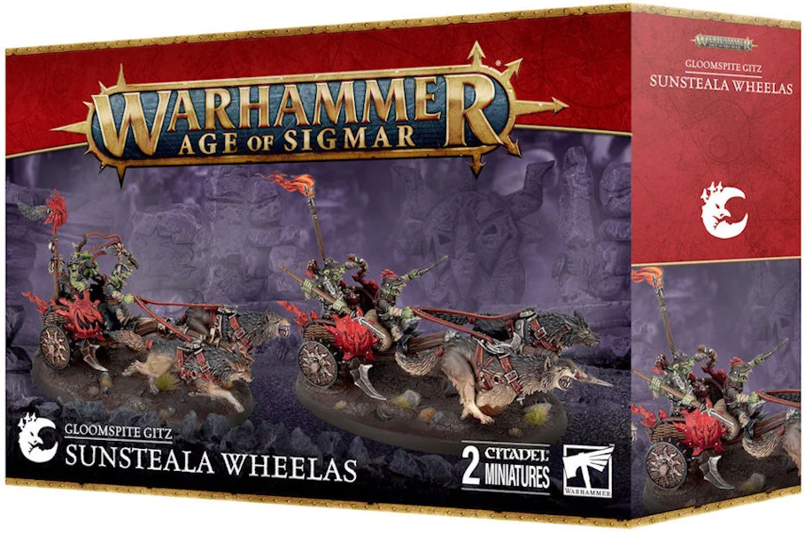 This multipart plastic kit builds two Sunsteala Wheelas, light chariots pulled by ravening Snarlfangs, for your Gloomspite Gitz armies in games of Warhammer Age of Sigmar. Armed with scything blades, and crewed by wicked grots armed with spears and bows, they're ready to careen wildly across the battlefields of the Mortal Realms, striking where your opponent is most vulnerable. They're able to keep up with your packs of Snarlfangs, and are ideal for adding extra hitting power to the lighter cavalry.