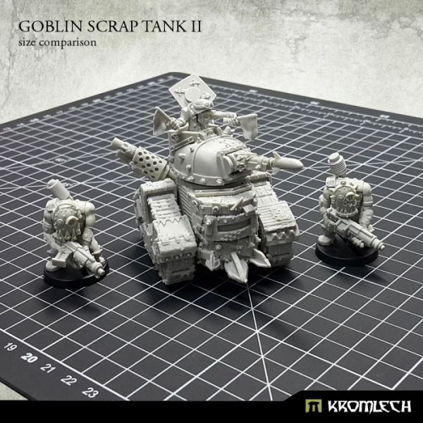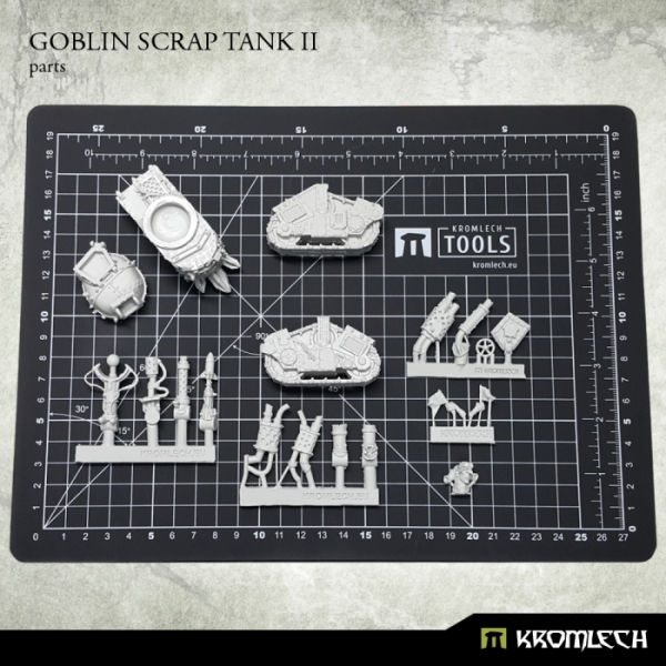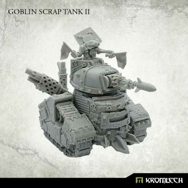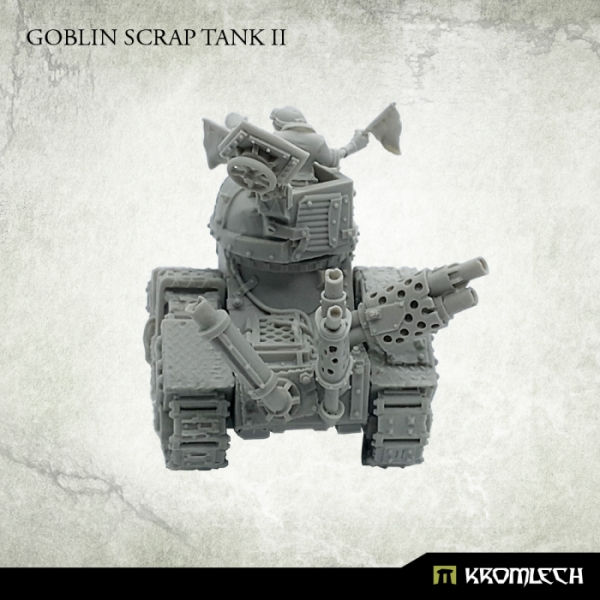 This multi part set contains one Goblin Scrap Tank resin model and a selection of turret weapons. Please note that this set includes a set of exhaust pipes which you can assemble as you like. You can but you do not have to use all.
