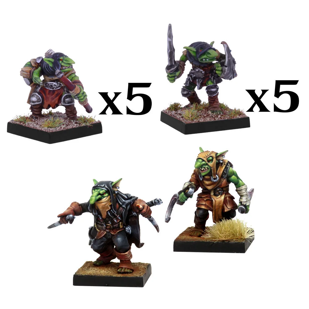 Small, unpleasant and spiteful, Goblins are utterly separate from their greenskin cousins, the Orcs. Goblins are not only smaller and less imposing but also far cleverer and more dexterous. They might not beat you in a straight fight, but to underestimate even a small force of Goblins would be a grave mistake. Contents: 10 Hard Plastic Goblin Spitters, Metal Rabble Upgrade Pack, 1 Resin Shanker, 1 Resin Sneak, and Vanguard Card Deck. Supplied unassembled and unpainted.