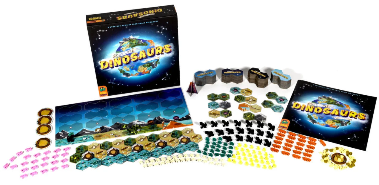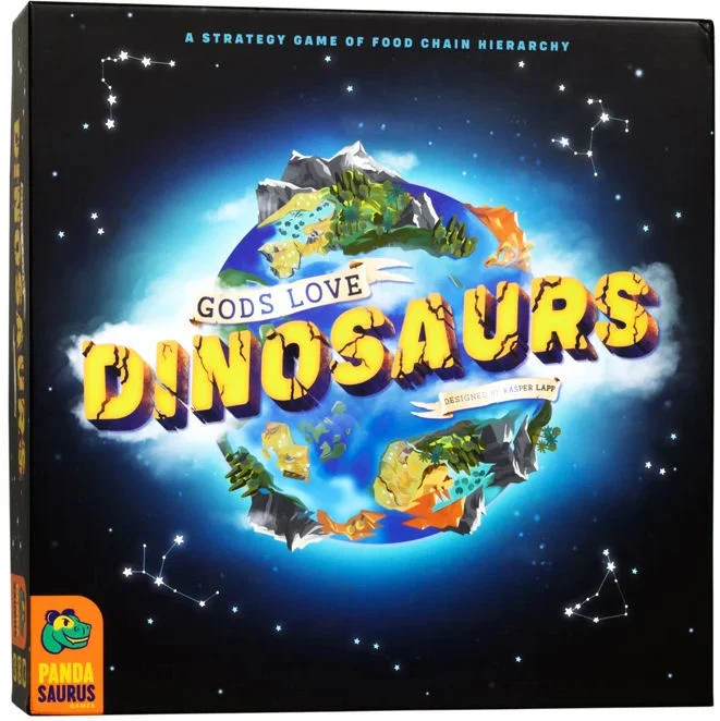 Gods Love Dinosaurs is a cheeky, wild, and timeless take on the scientific tale as old as life itself by Spiel des Jahres-nominated designer Kasper Lapp (Magic Maze).