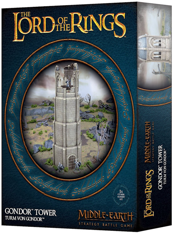 This multipart plastic kit builds a Gondor Tower – a mighty spire of wrought stone, with wooden doors reinforced by iron. This tower stands roughly 12 inches tall, and can be built with one, two, or three doors. You can assemble the top of the tower in ruins – as though destroyed by a catapult or crumbled by time – with additional ruins to arrange at its base. Alternatively, you can build the tower with an intact domed roof, which is designed to be assembled without glue, allowing you to remove it and battle in its interior during gameplay. Either way, the detailed rooftop has ample room to place your miniatures inside.