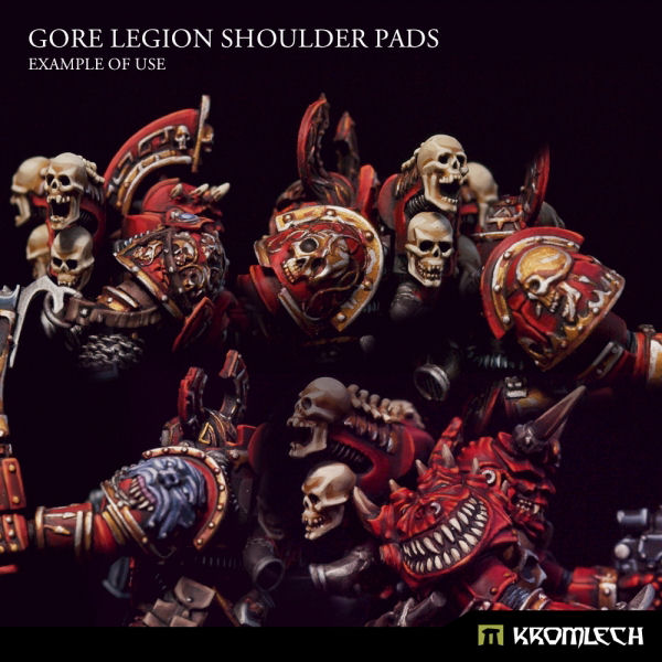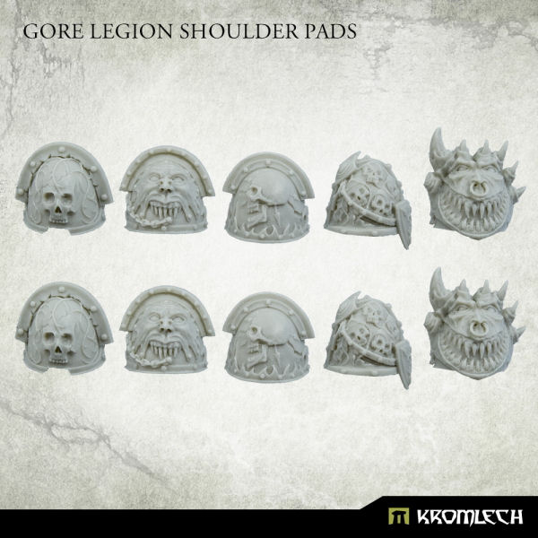 This set contains 10 high quality resin Gore Legion Shoulder Pads, with pair of each of five designs. Designed to fit futuristic 28mm heroic scale heavy armoured models. Great for representing bloodthirsty berzerkers rampaging in the vanguard of Chaos forces.