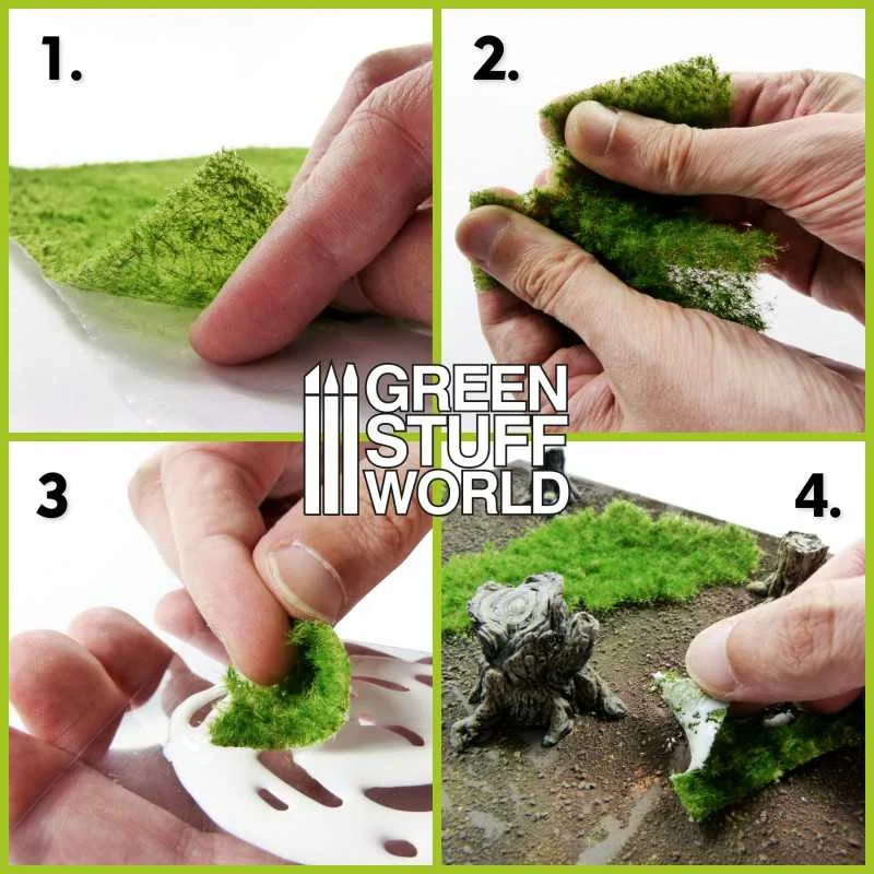 Grass mat rollout for instantly setting up a large surface for landscaping and scenery-making, especially for wargames. Grass mats are available in different styles, and can be complemented by adding various layers of foliage, turf mounds, tufts and shrubberies for a very realistic setting.