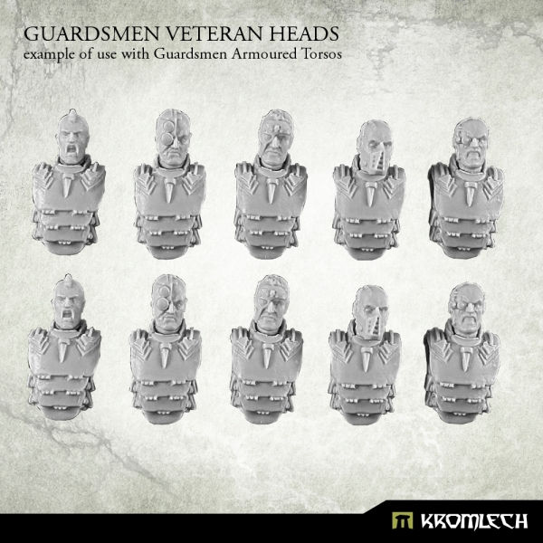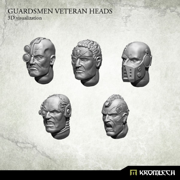 This set contains 10 Guardsmen Veteran Heads (2 of each design). Designed to fit futuristic 28mm heroic scale human soldiers models.