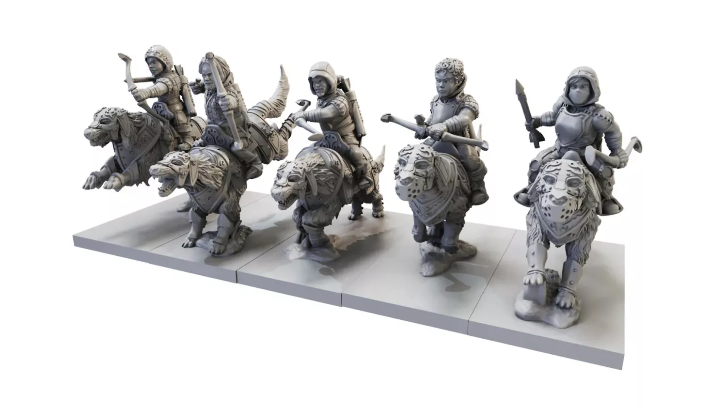 Contents: 1x Halfling Sprue, 3x Resin Halfling Poachers Upgrade (5), 1x 20mm Base Sprue, 5x MDF Cavalry Bases