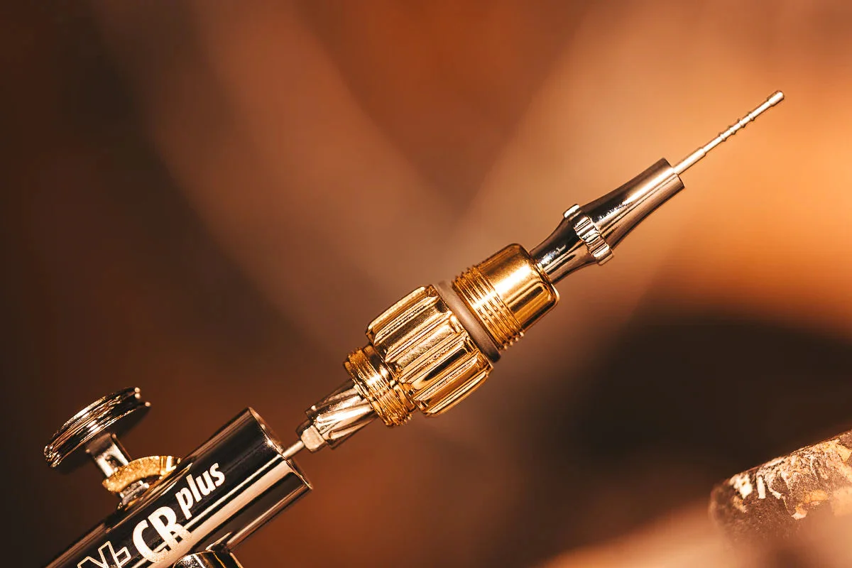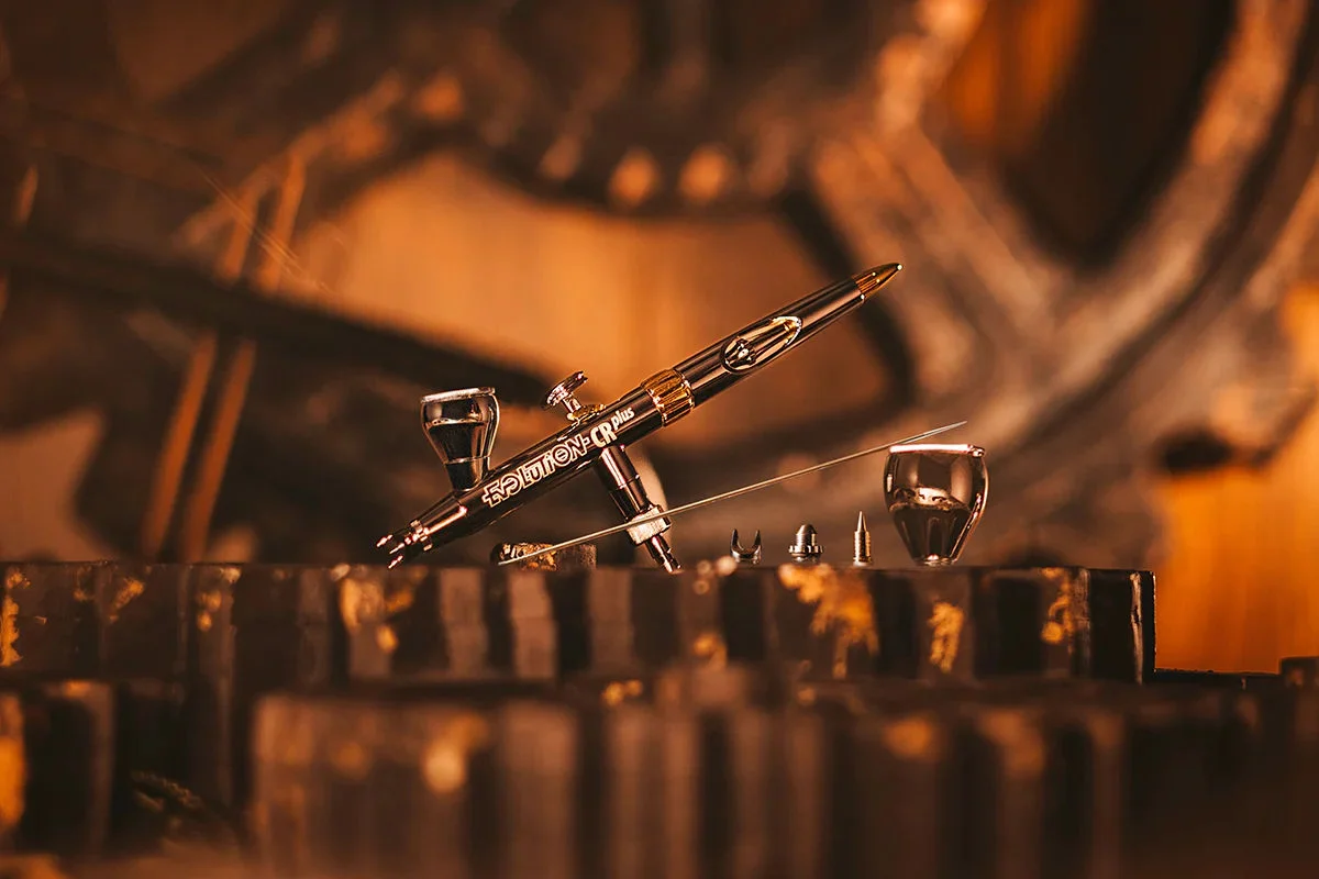 New FineLine Head Design: our new 0.28mm and 0.45mm sizes give better detail than our previous 0.2mm, but with more robustness, less clogging and better sealing. Really, the detail is breathtaking! The Solo comes with the 0.28mm and a 2ml cup, and the 2in1 set comes with the 0.28mm and the 0.45mm with both the 2ml and 5ml cups for ultimate versatility. Excenter Cam Control – our trigger system has been redesigned to create a perfect connection between your finger and the needle motion. Our unique Excenter now behaves like a true cam system, as accurate and tuneable as in a performance engine! The Excenter cam shape on the EVOLUTION 2024 gives a more responsive feel during detail work whilst remaining accessible and easy to control for a non-expert. Speed Clean Trigger – our Excenter now gives nearly 20% more travel to the needle, giving a far faster flushing and cleaning process. This airbrush is designed to work hard, and work fast. Clog Control System: a new interpretation of our FineLine head concept for progressing airbrushers –you can see the needle tip, clean the needle tip without needing a brush, but it is always protected. A clean needle tip is the solution to airbrushing with no colour clogging. Color Control – infinitely adjustable needle stop system to support progression, whilst being very fast to adjust and dial in/ out due to its unique triple start thread system. Flexible Architecture: you can accessorise your EVOLUTION 2024 CRplus with micro, 2ml or 5ml cups, and fit any H&S head size to fit your needs. The Solo variant comes with the 2ml cup and the 2in1 set comes with the 2ml and the 5ml cups. Tool Free – strip your airbrush with no tools! Clean up is faster and easier than ever, and more bullet proof than ever. Full CRplus specification – triple chrome plate and gold finishing for ultimate durability.