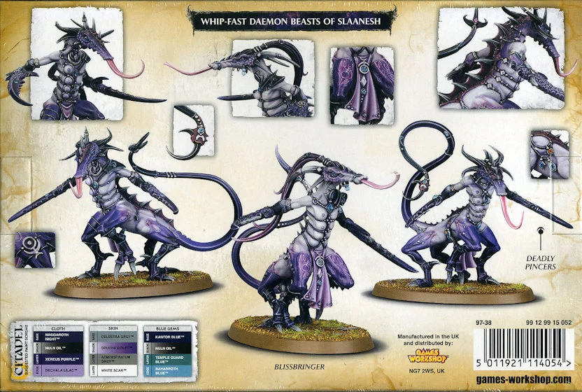 Förpackningen innehåller 63 delar i plast för att montera 3 Fiends of Slaanesh. Det finns även alternativa delar för att göra en av dem till Blissbringer. Lämpliga baser medföljer.