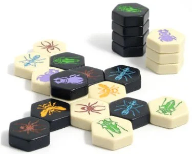 Hive is a board game with a difference. There is no board! The pieces are added to the playing area thus creating the board. As more and more pieces are added the game becomes a fight to see who can be the first to capture the opposing Queen Bee. The soldier ants battle to keep control of the outside of the hive, whilst the Beetles climb up to dominate the top. Spiders moving into holding positions as the Grass Hoppers jump in for the kill. Keeping one eye on the hive and the other on your opponents reserves, the tension builds as one wrong move will see your Queen Bee quickly engulfed; .... game over!