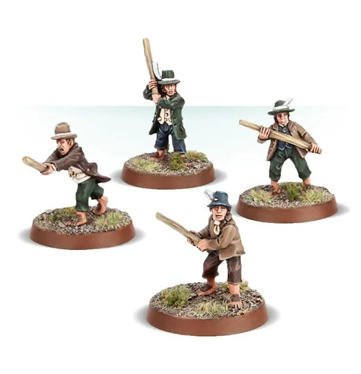 This is a set of metal miniatures which make up 4 Hobbit Shirriffs. Diminutive in stature and barefoot, as expected from Hobbits, each of them is clad in a feathered hat, jacket and waistcoat (1 model has his jacket fastened, with a cravat around his neck) and is carrying a stout club in both hands. This kit comes as 4 components, and is supplied with 4 Citadel 25mm round bases. These miniatures are supplied unpainted and require assembly.