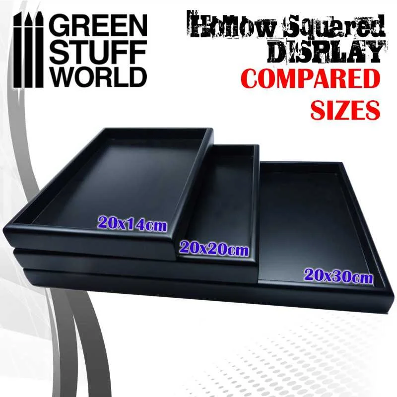 Hollow squared display of MDF wood, with a hollow inside, ideal for exhibiting your figurines or other pieces that may need depth or to contain any liquids. The base is covered with a slim dark green coloured carpet. Measurements: 20x14 cm Height: 1,5 cm Colour: black Material: MDF Wood with upholstered base