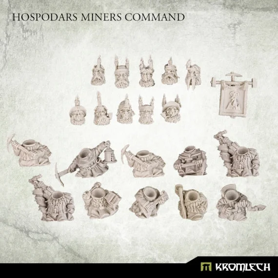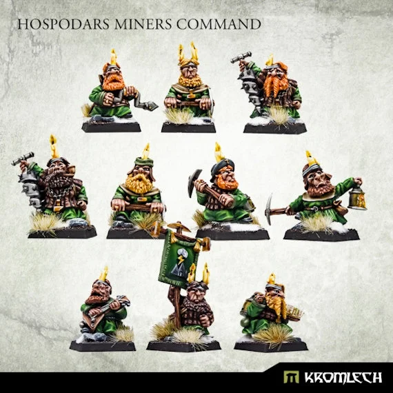 This set contains squad of ten highly detailed, slavic Dwarves of Hospodars tribe - leaders of Miners' guild ready to guard their workshops and families. Supplied unassembled and unpainted. Designed to fit 28mm heroic scale wargames. Inside the package you'll find: - one Miner Champion - one Miner Musician - one Miner Standard Bearer - seven multi-part Hospodars Miner armed with pickaxes and drills - ten 20mm plastic square bases.