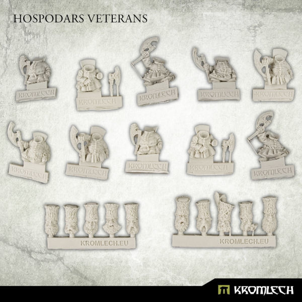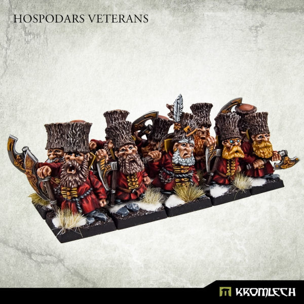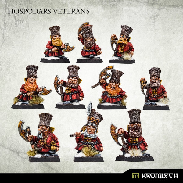 This set contains squad of ten highly detailed, slavic Dwarves of Hospodars tribe - warriors that survived long enough to be considered clan's best. Supplied unassembled and unpainted. Designed to fit 28mm heroic scale wargames. Inside the package you'll find: - ten multi-part Hospodars Veterans with axes - ten 20mm plastic square bases.