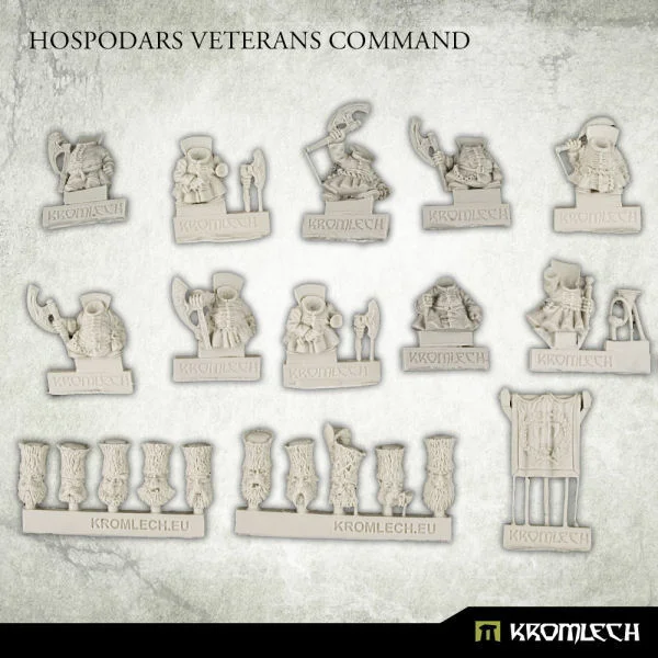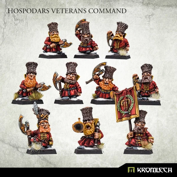 This set contains squad of ten highly detailed, slavic Dwarves of Hospodars tribe - warriors that survived long enough to be considered clan's best. Supplied unassembled and unpainted. Designed to fit 28mm heroic scale wargames. Inside the package you'll find: - one Veteran Champion - one Veteran Musician - one Veteran Standard Bearer - seven multi-part Hospodars Veterans with axes - ten 20mm plastic square bases.