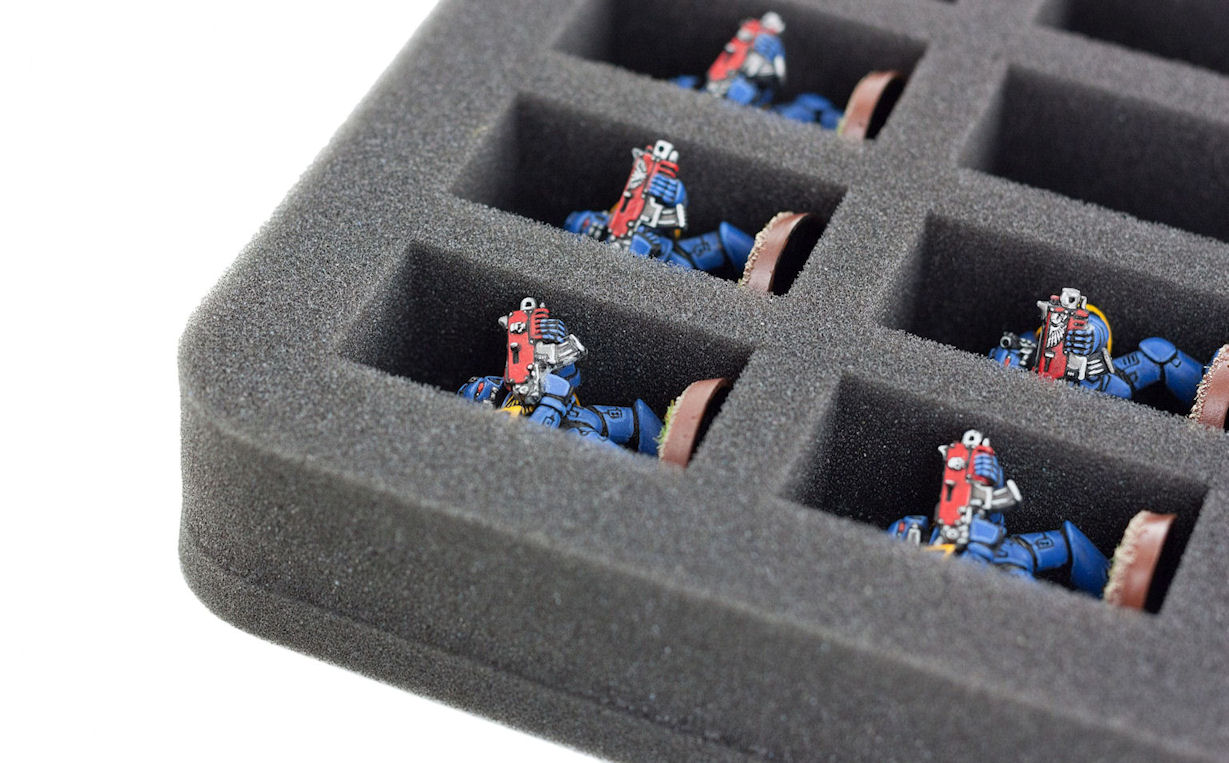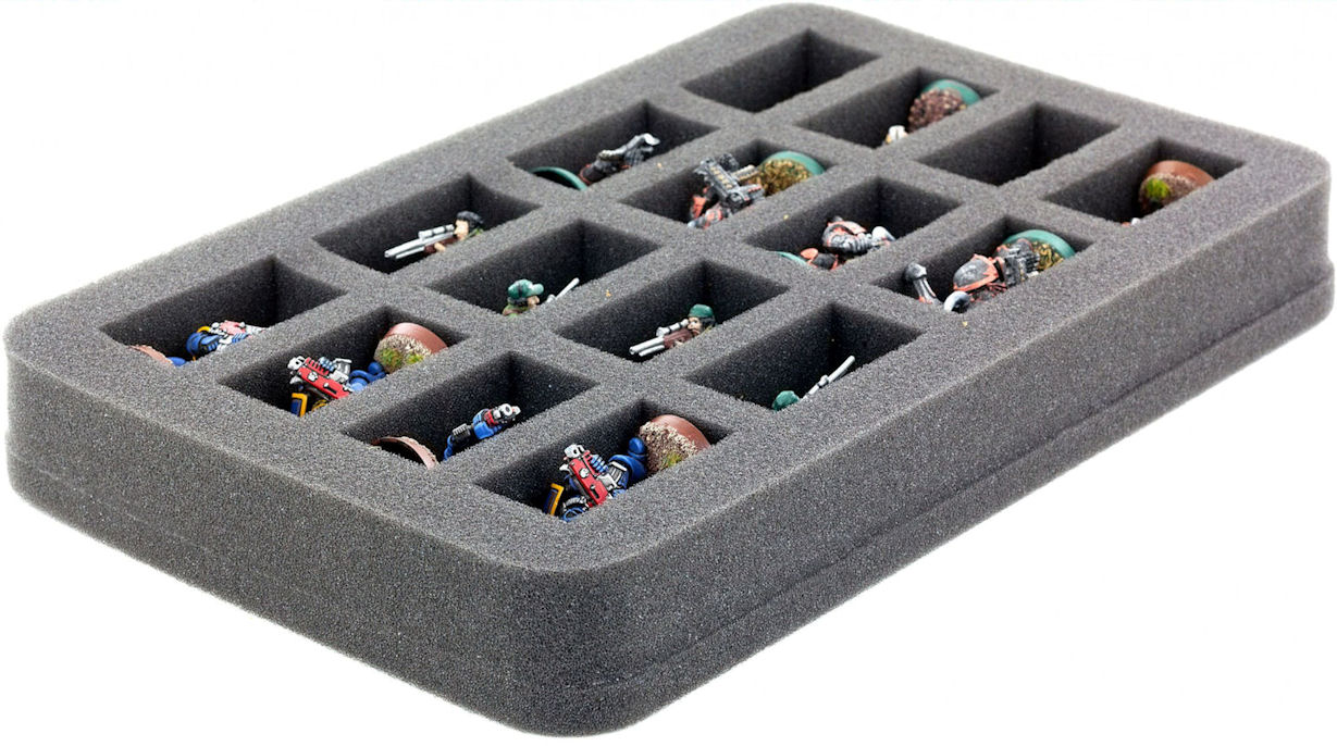Perfect for all tabletop standard miniatures in 28 mm systems. This foam tray has 16 slots - each slot 50 mm x 25 mm x 25 mm deep.