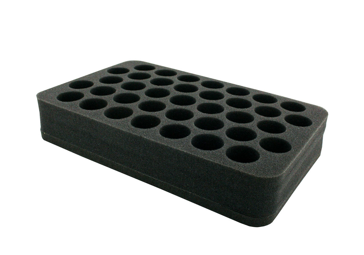 For proper storage of up to 37 paint bottles - Suitable for e.g. 17 ml model color bottles from Vallejo and 18 ml bottles from Army Painter. Your color palette has become so big that you slowly lose track of it? You are looking for a solution to store and transport your Vallejo and Army Painter paint bottles in upright position? Then this Feldherr Half-Size foam tray is the perfect solution for you. Up to 37 model color bottles can be stored here in a clearly arranged and transportable way. Thanks to the lightweight material, the foam insert is a wonderful addition to your hobby bag. Each of the 37 compartments has a diameter of 28 mm and is 25 mm deep. The insert is therefore ideal for the horizontal storage of 17 ml Model Color bottles from Vallejo, 18 ml bottles from Army Painter and similarly sized paint bottles from other manufacturers. Since the bottles are not completely embedded in the insert, we recommend using a second insert upside down as a lid for transport. The set is available separately (HS07Set). The Half-Size foam tray has the dimensions: 275 mm x 172 mm x 35 mm total height (25 mm usable height + 10 mm foam base). high-quality, fine pored foam chlorine and acid-free Made in Germany