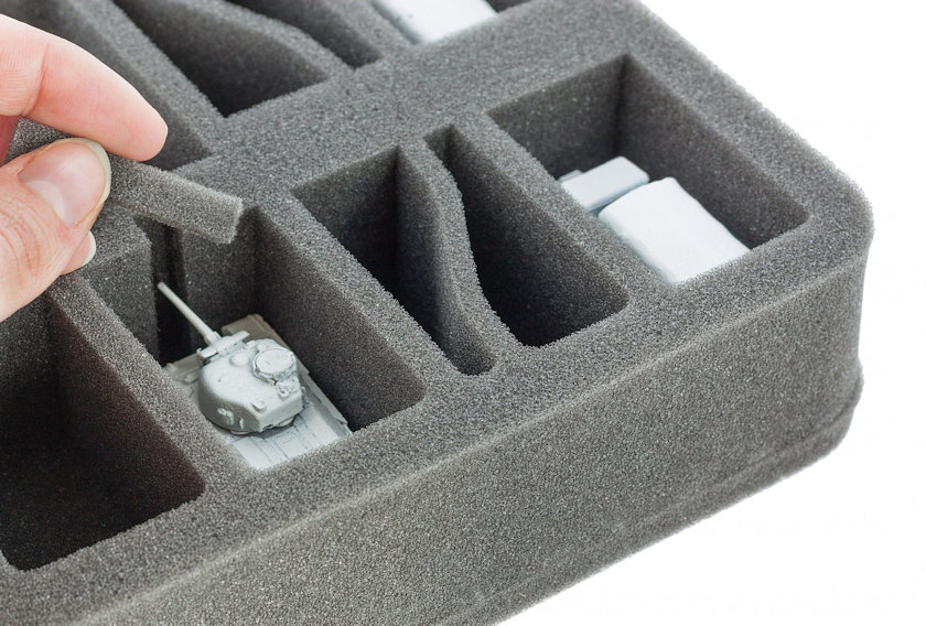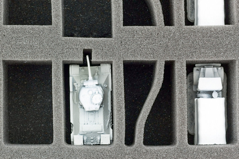 Special Foam Tray for all Flames of War (FoW) Players! The tray hold 8 Tanks and Gun Turrets. Ready to use - glued 10 mm foam base. ​The 50 mm depth of the foam is result from 10 mm foam base and slot foam tray with 40 mm effective depth.