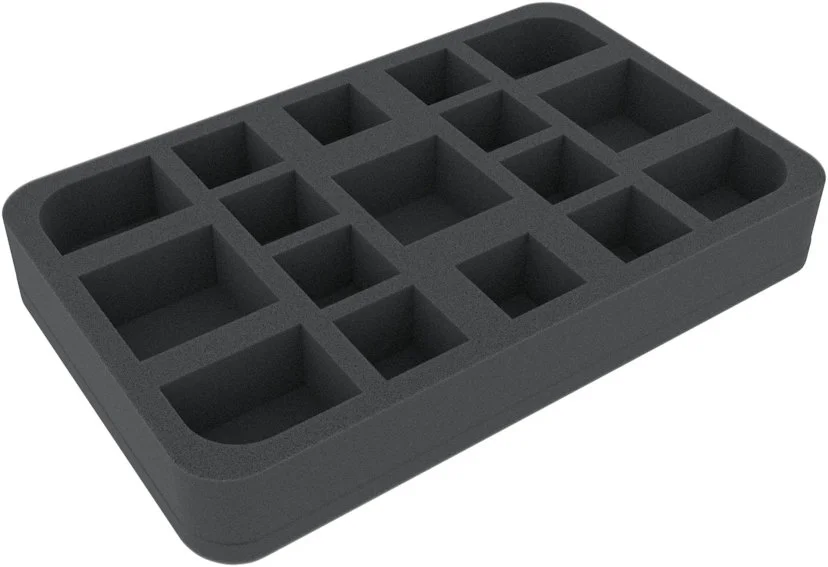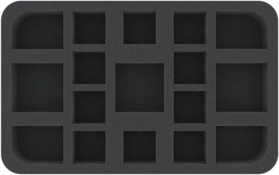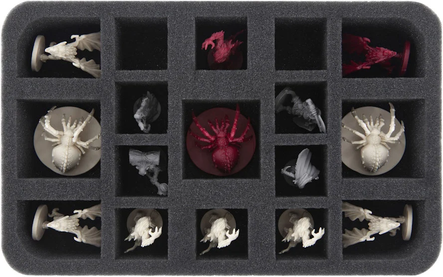 All heroes and monsters will find a safe place in custom-made compartments of this tray. Three larger compartments for the Bane Spiders, four with rounded corners for the Razorwings and four square ones for the Beastmen ensure that wings and spider legs remain intact. Trenloe the Strong, Elder Mok, Laurel of Bloodwood and the mage Shiver are also safely housed in compartments tailored to them. Clear, abrasion-proof and ready for use at any time.