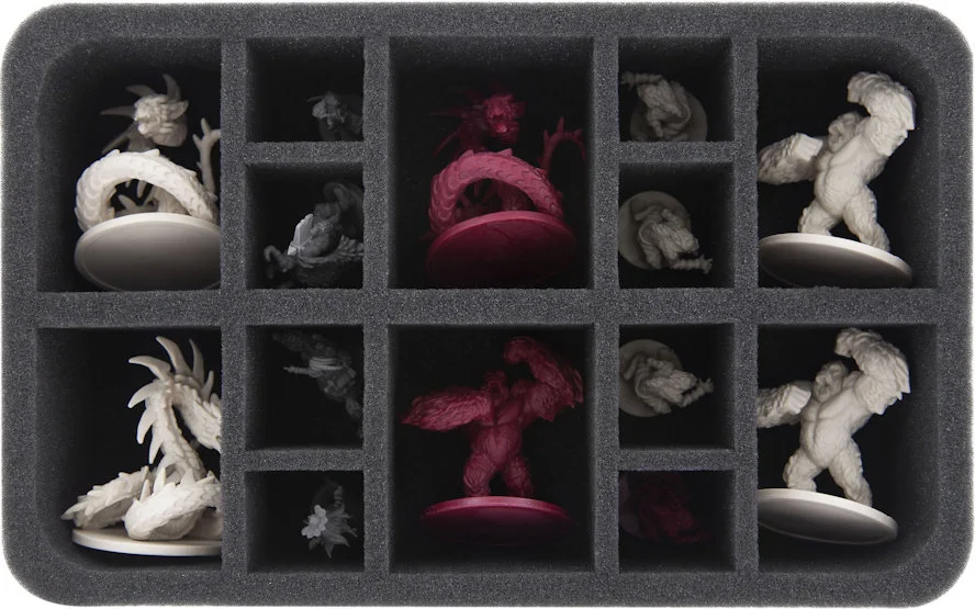 Here all 14 miniatures will find a safe place. The big monster figures, three Blood Apes and three Nagas, get correspondingly large compartments. A row of small compartments is occupied with the Ferroxs. On the other side your heroes Okaluk and Rakash, Tatianna, Nanok of the Blade, and Seer Kel will find their padded shelter. The compartments are adapted to the size of the miniatures. Therefore they are optimally protected against collision and abrasion during transport. This does not only preserve the colors, sensitive details such as axes or claws remain intact as well.