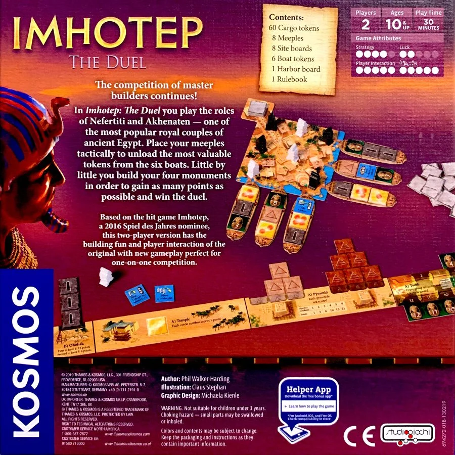 The competition of the builders continues! Players take on the roles of Nefertiti and Akhenaten - one of the most famous royal couples in Egypt. The respective pawns must be tactically cleverly placed to unload the most valuable tiles from the six boats. Gradually, each player builds on his own four monuments in order to gain as many fame points as possible. A competitive strategy game in direct one-on-one - different rules, new tactics.