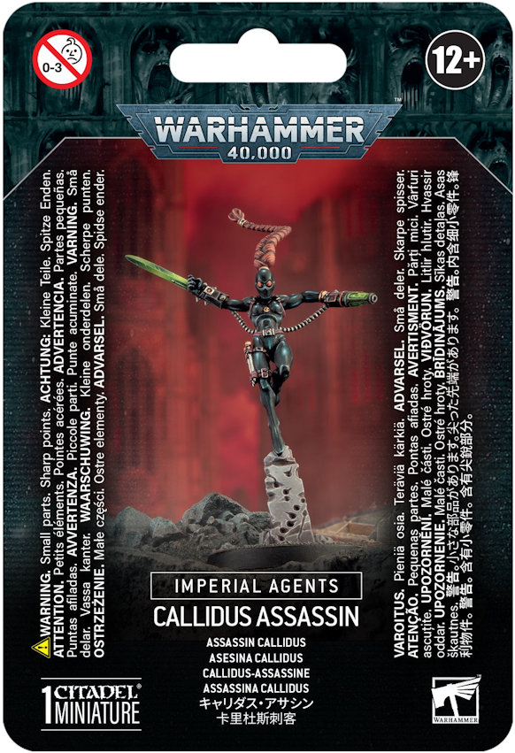 This multipart plastic kit builds a Callidus Assassin, a shapeshifting Imperial Agent deployed to undermine and eliminate enemies of the Imperium. Clad in a synskin bodyglove, the Callidus is an acrobatic killer armed with a C'tan phase blade and a neural shredder pistol, as well as a selection of poisoned blades strapped to their thigh.