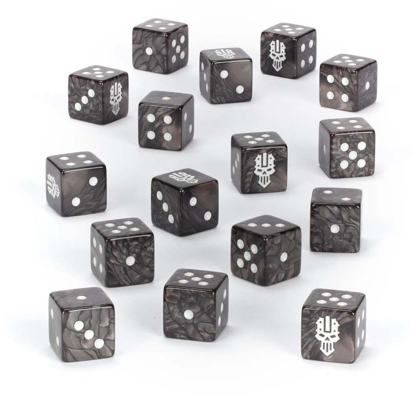 Iron Warriors Dice Set är ett tematiskt tärningsset designat för att matcha den brutala estetik som kännetecknar Iron Warriors. De är gjutna i pärlemorskimrande mörksilver plast med tydliga markeringar som gör dem lätta att läsa under spel.