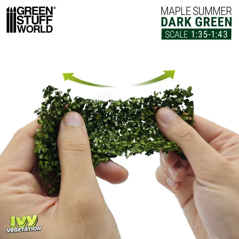 Ivy Foliage vegetation sheets from Green Stuff World are specialized sheets with leaves of different types, colors, and sizes designed to replicate the appearance of vine leaves and the leafiness of a tree on a miniature scale. At Green Stuff World, we offer a wide selection of miniature basing materials, hobby leaves, vegetation, and many other types of paper plants for you to choose from to suit your project. With our variety of products, you can create scenes, figures, and miniature bases, and dioramas quickly and easily, taking realism to a new level. Don't wait any longer and dive into the world of possibilities that our miniature branch and leaf mats have to offer. Add a touch of nature to your creations with Green Stuff World. Application and assembly: If you are going to dress a wall of a building with miniature vines it is much more convenient to use a cyanoacrylate glue and go gluing some of the branches to the surface. If you are going to make a miniature tree, it is advisable to use PVA glue or Tuft Glue. As there are many qualities of white glue and it is much easier to loosen the weeds from them, we strongly recommend using Tuft Glue for these functions so that it has a long-term hold. Recommended Scale: 1:35 - 1:43 Leaf Type: Maple Color: Dark Green Content: 1x Realistic Ivy Foliage in 140x70mm