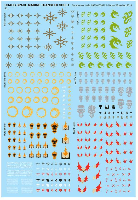 Chaos Space Marines transfer-karta med 364 högkvalitativa waterslide-dekaler för att ytterligare dekorera dina modeller