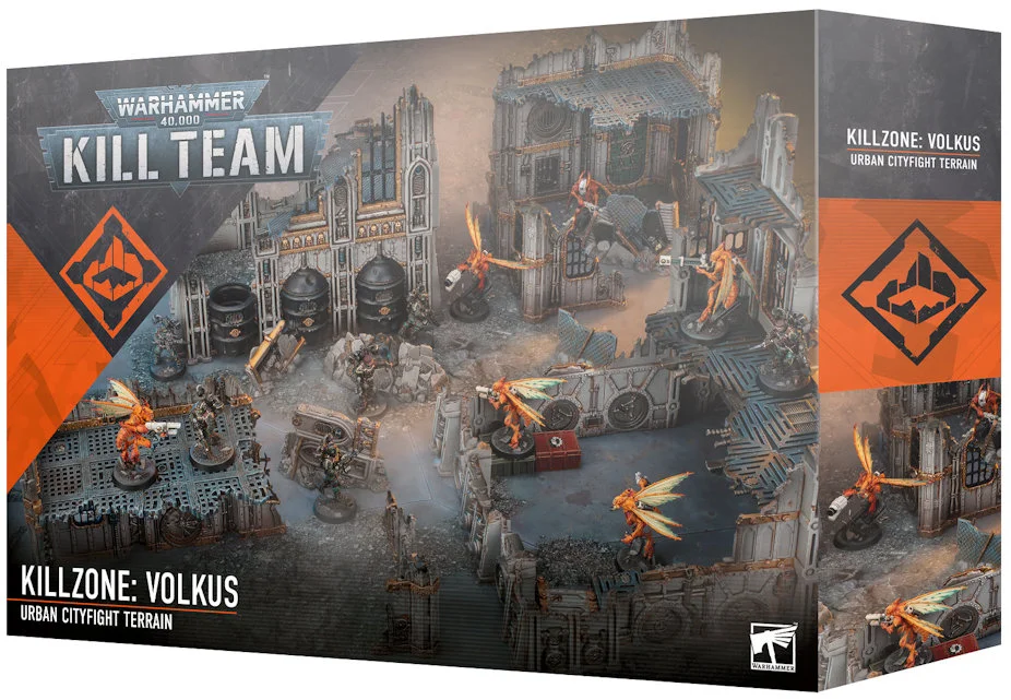 This set includes a game board and a multipart plastic kit that builds 14 terrain pieces to create Killzone: Volkus – an urban battlefield to enhance games of Kill Team. Featuring ruined buildings and structures of various sizes alongside strongholds for cover, and themed rubble scatter terrain, the kit recreates the ruined, multi-leveled industrial complexes of Volkus, and supports vertical play.