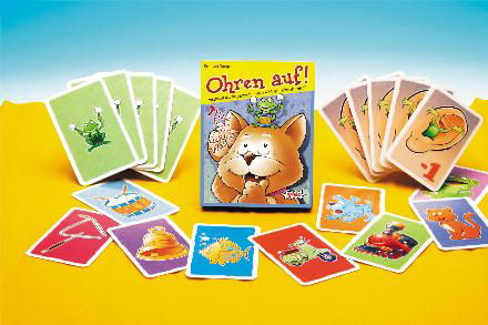 For 2 to 6 players aged 5 and up, length 20 minutes. One after the other, each player takes on the part of the ‘active player’ for a whole turn. The active player must try to find the matching pairs of sounds. The difficulty is that the active player does not get to see the images on the cards, he only hears the sounds associated with them. So – be all ears! Whoever needed the fewest attempts during his turn as active player wins the game.