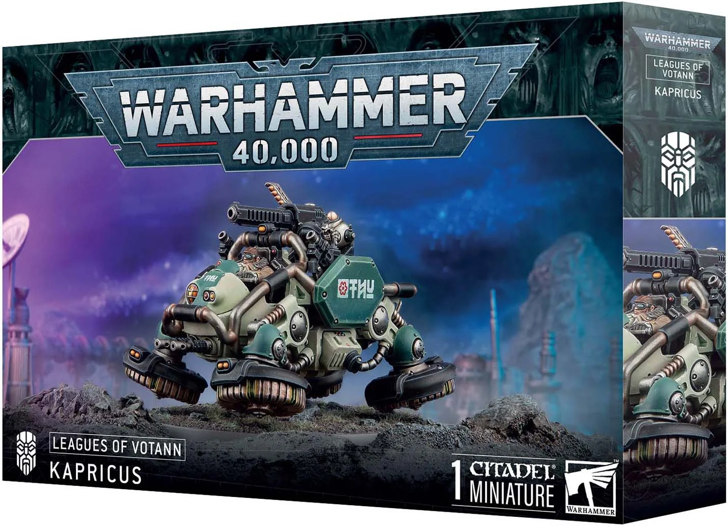 This multipart plastic kit builds a Kapricus Defender, a swift fire support vehicle for your Leagues of Votann armies in games of Warhammer 40,000. It's fast and tough with one pintle-mounted heavy weapon – your choice between an armour-busting magna-rail cannon, or an infantry-shredding HYLas rotary cannon – and twin-mounted magna-coil autocannons. It's ideal for supporting your advance with plenty of extra firepower. You'll find six heads in the kit to customise the crew, including a pair of Ironkin heads.