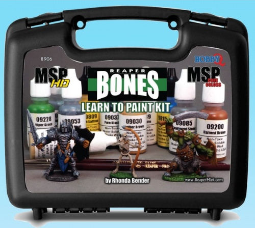 This Kit includes: 11 Bottles of MSD Core Colors and MSP HD Paint, 2 Brushes, 3 Bones Miniatures (Pictured) and an instruction Guide by Rhonda Bender. 11 Master Series Paints included are: 9030: Leather Brown, 9037: Pure Black, 9039: Pure White, 9053: Honed Steel, 9054: Polished Silver, 9085: Shadowed Stone, 9200: Harvest Brown, 9228: Viper Green, 9271: Dirty Bone, 29815: Dragon Blue, 29809: Pale Saffron