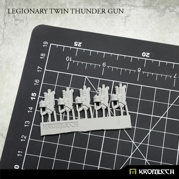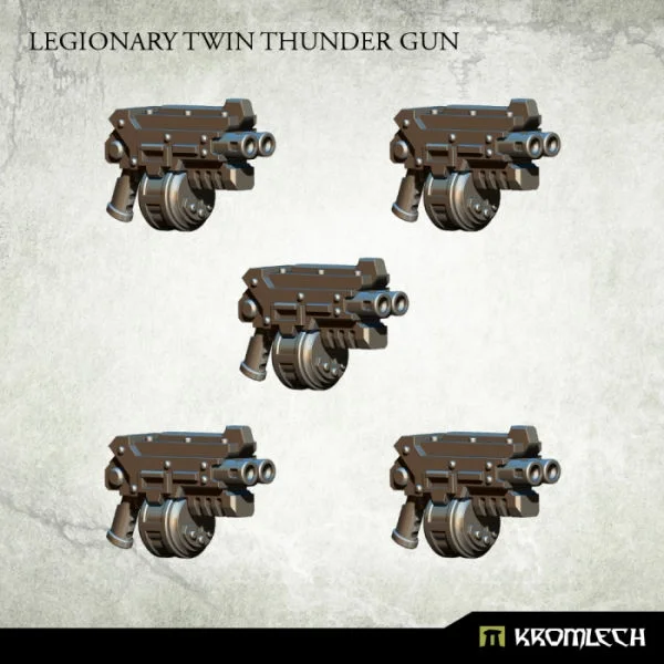 This set contains five resin Legionary Twin Thunder Guns designed to fit futuristic heavy armoured troopers.