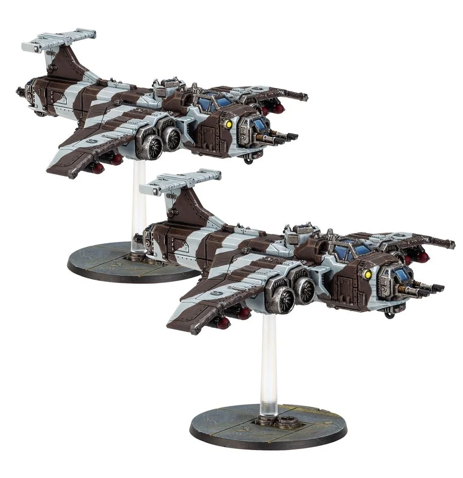 This multipart plastic kit builds two epic scale Marauder Bombers. These aircraft feature tough armour, nose-mounted lascannons, and a pair of heavy bolter turrets – one dorsal, one mounted on its rear. Each Marauder Bomber has a capacious bomb bay visible on its underside, and the kit includes a selection of hellstrike missiles and wing bombs to mount under their wings. These models can also be used in games of Aeronautica Imperialis by mounting them on appropriate Aeronautica Imperialis bases, sold separately. The set includes: - 2x Marauder Bombers - 8x hellstrike missiles - 8x wing bombs - 2x Legions Imperialis 40mm Round Flying Bases with ball socket stems - 1x Aeronautica Imperialis Marauder Bomber Transfer Sheet These miniatures are supplied unpainted and require assembly – we recommend using Citadel Plastic Glue and Citadel Colour paints. Please note that the base designs shown in the imagery may differ to those supplied in this product.