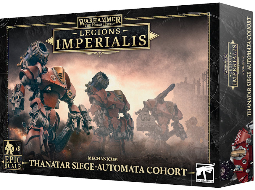 This multipart plastic kit builds eight epic scale Thanatar Siege-Automata miniatures for use in Mechanicum Taghmata and Dark Mechanicum armies, or as allies in Solar Auxilia armies, in games of Legions Imperialis. Four miniatures can be built with Sollex heavy-las, mauler bolt cannons, and graviton rams, while the other four can be equipped with plasma mortars, which can be built with open or closed muzzles, and mauler bolt cannons.